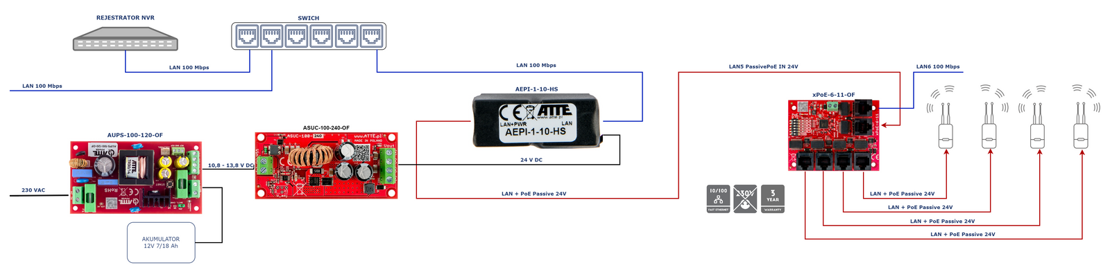 Przykłady zastosowania ASUC-100-240-OF do zasilenia 4 punktów dostępu zasilaniem 24V PoE