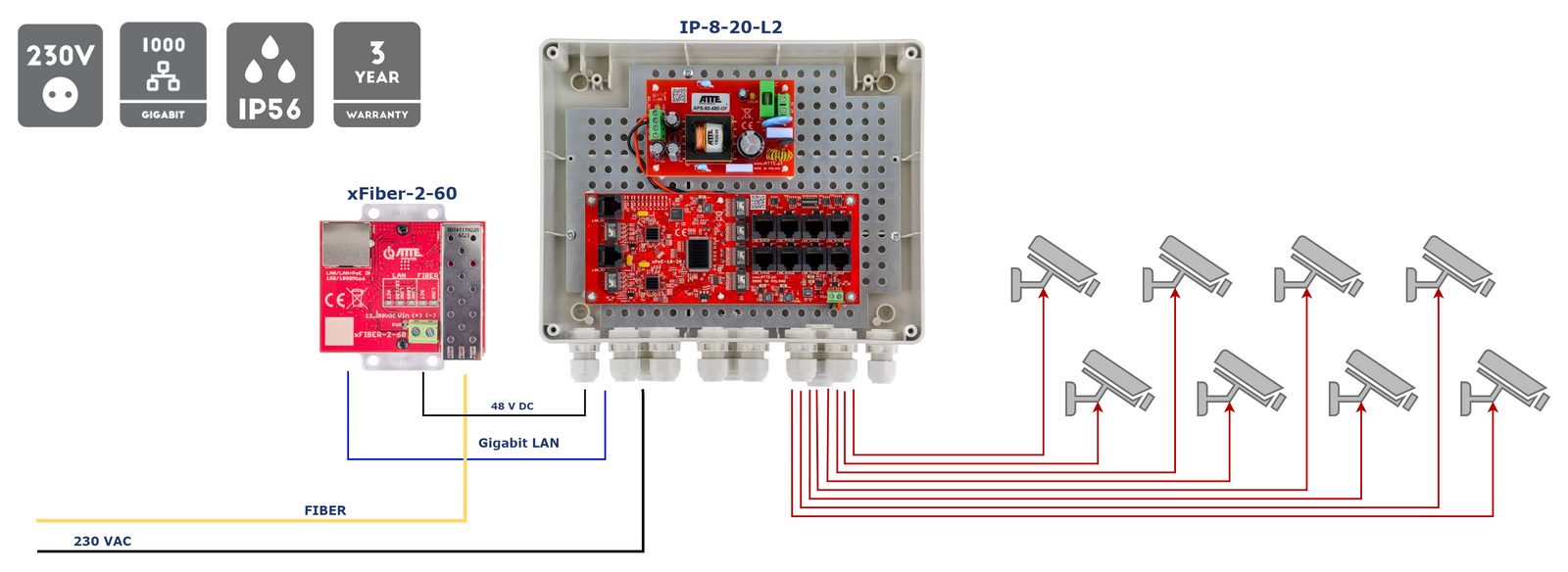 Przykładowe zastosowanie zestawu IP-8-20-L2 do zasilenia 8 kamer IP PoE z dodatkowym mediakonwerterem światłowodowym xFIBER-2-60
