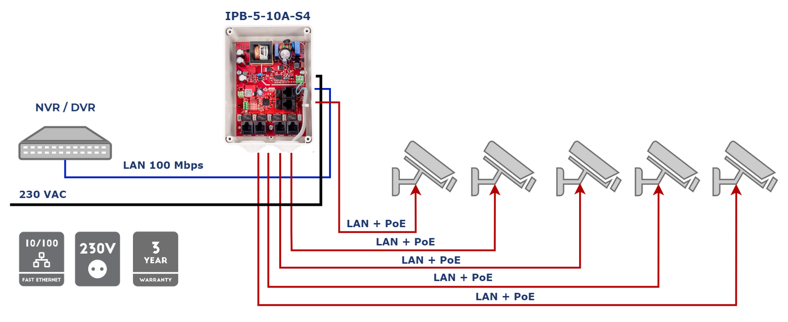 IPB-5-10A-S4 został zaprojektowany jako kompletne, zintegrowane rozwiązanie zasilania systemów telewizji przemysłowej IP.