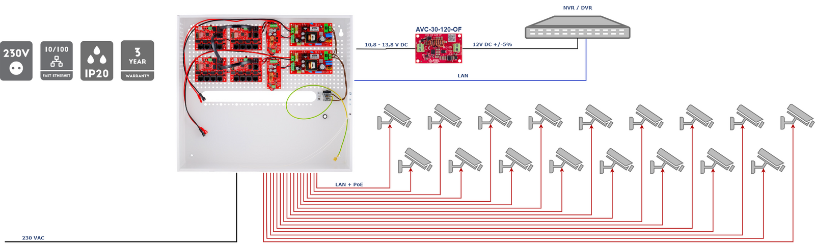 IPUPS-17-11-H to gotowy zestaw, dedykowany do buforowego zasilania systemu telewizji przemysłowej IP składającego się z 17 kamer IP. Elektroniczne zabezpieczenia wyjść PoE zapewniają ciągłość pracy całego systemu przy zwarciu, lub przeciążeniu pojedynczych gałęzi zasilania, oraz automatyczny powrót napięcia po ustąpięniu awarii.