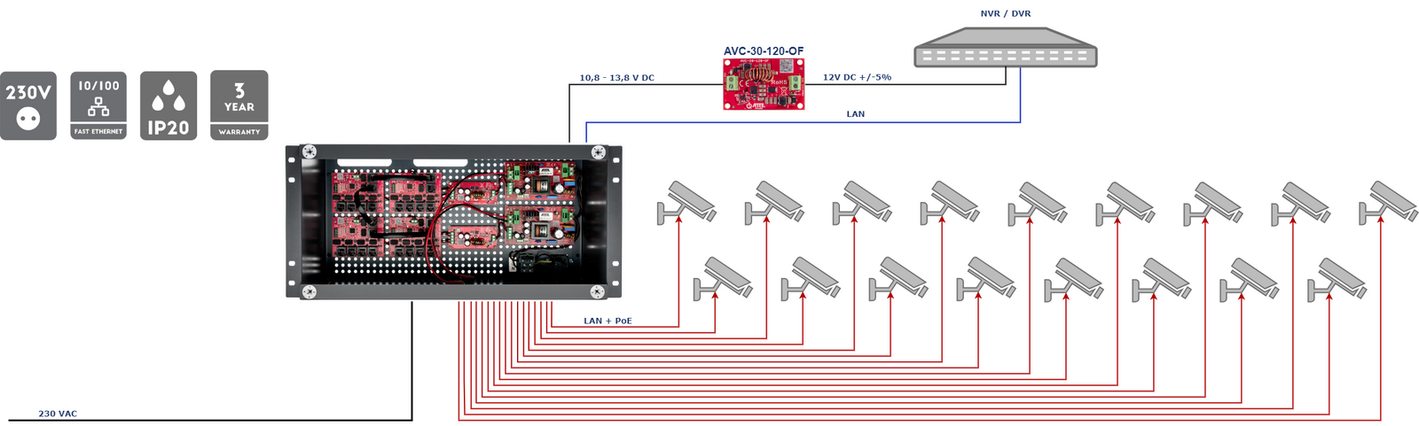 Przykładowe zastosowanie zestawu IPUPS-17-11-R5U0 do zasilenia rejestratora razem z 17 kamerami IP PoE