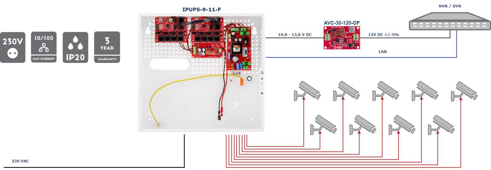 IPUPS-9-11-F to gotowy zestaw, dedykowany do buforowego zasilania systemu telewizji przemysłowej IP składającego się z 9 kamer IP. Elektroniczne zabezpieczenia wyjść PoE zapewniają ciągłość pracy całego systemu przy zwarciu, lub przeciążeniu pojedynczych gałęzi zasilania, oraz automatyczny powrót napięcia po ustąpięniu awarii.