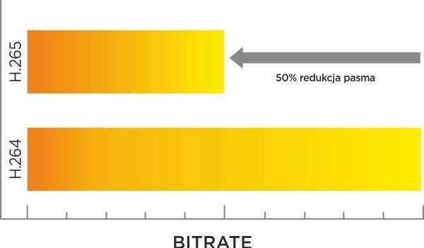 Kamera korzysta z zaawansowanej kompresji obrazu H.265, będącej następcą popularnej w systemach CCTV kompresji H.264. Nowa wersja umożliwia nawet dwukrotnie mocniejszą kompresję danych, przy praktycznie niezmniejszonej jakości obrazu. Dzięki czemu możliwa jest archiwizacja nagrań z dłuższego okresu i dodatkowo zmniejszają się wymagania dotyczące przepustowości łącza internetowego. Obsługiwane kompresje obrazu: