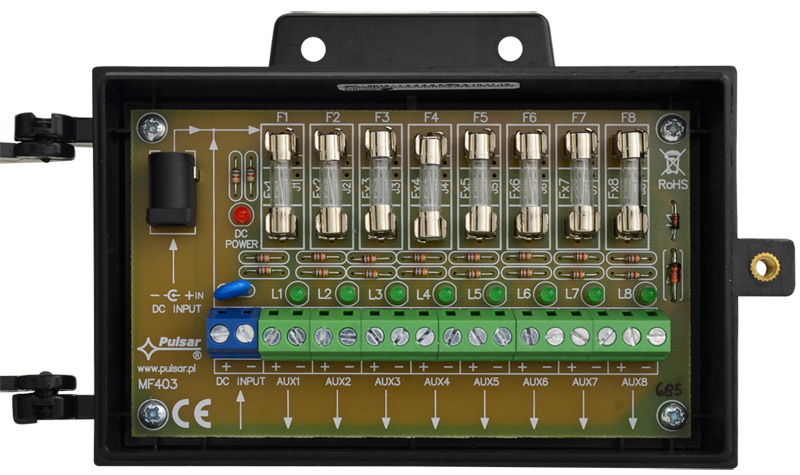 Zadziałanie bezpiecznika PTC sygnalizowane jest przez zgaszenie odpowiedniej diody LED modułu: L1 dla AUX1, L2 dla AUX2 itd. Dodatkowo wejście modułu zabezpieczone jest warystorem chroniącym zasilacz przed skutkami wystąpienia przepięć w układzie zasilania.