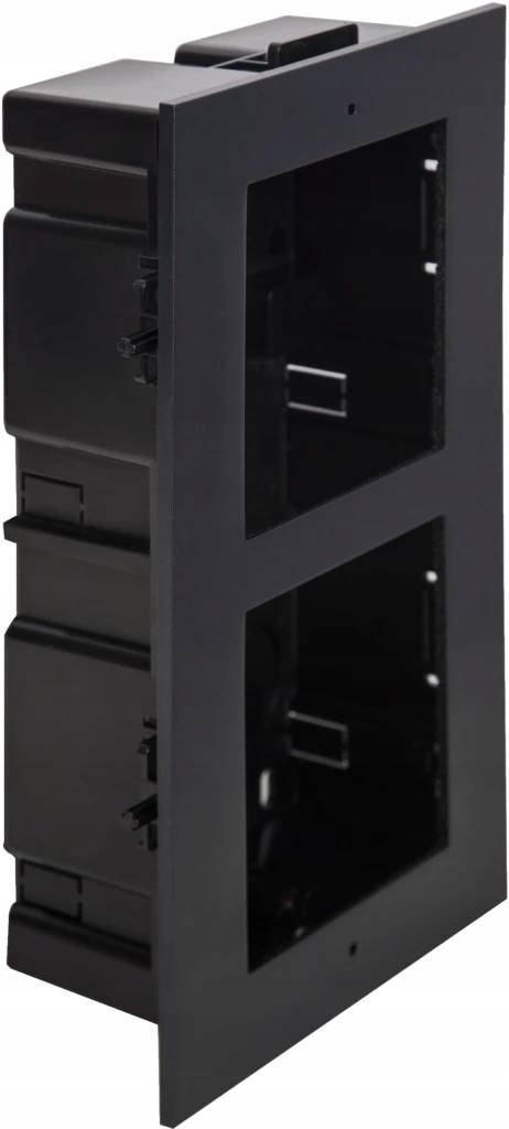 DS-KD-ACF2- Ramka z puszką do montażu podtynkowego do modułów Hikvision. Ramka przeznaczona jest do montażu dwóch modułów wchodzących w skład systemu wideodomofonów Hikvision. Ramka została wykonana z odpornego i wytrzymałego aluminium, a puszka z plastiku. Nowoczesny design zapewnia estetyczny wygląd ramki wraz z modułem.