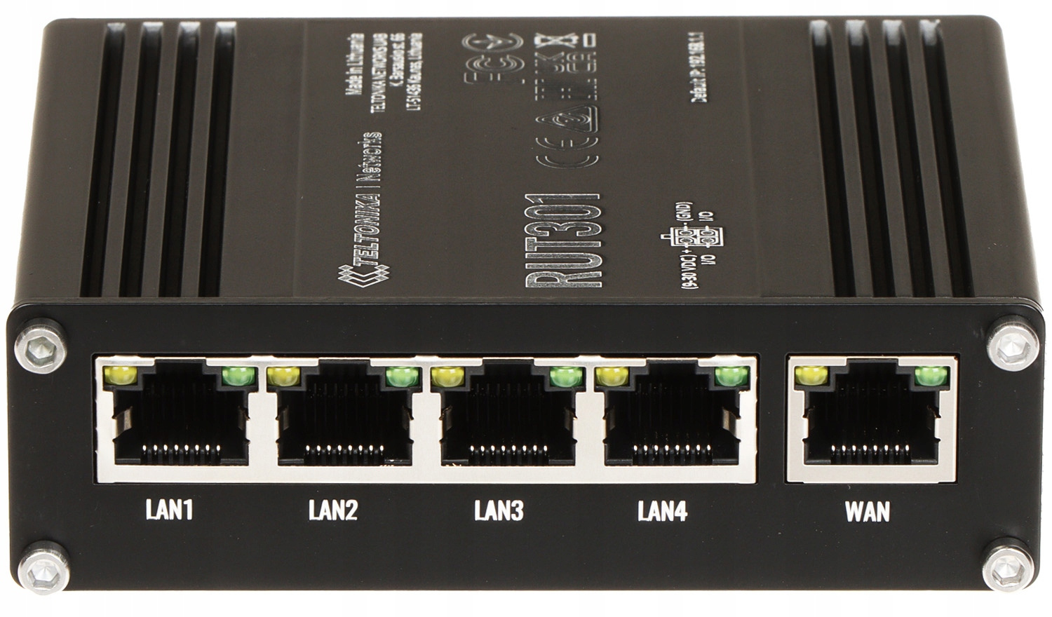 Router RUT301 to jeden z najbardziej ekonomicznych przemysłowych routerów Ethernet na rynku IoT, zapewniający niezawodną łączność sieciową i zaawansowane funkcje bezpieczeństwa. Urządzenie wyposażone jest w 5 portów Ethernet, 2 konfigurowalne cyfrowe wejścia/wyjścia i port USB 2.0, co zapewnia kompatybilność z maszynami przemysłowymi, urządzeniami korporacyjnymi lub sprzętem handlowym. Rutererem zarządza system operacyjny RutOS i obsługuje protokoły przemysłowe, takie jak Modbus, DLMS, DNP3, OPC UA, a także jest kompatybilny z systemem zarządzania RMS umożliwiając wydajne zdalne i lokalne zarządzanie urządzeniem. Do zarządzania dedykowana jest aplikacja Teltonika RMS Router Teltonika RUT301 posiada 4-pinowe przemysłowe gniazdo zasilania oraz obsługuje szeroki zakres napięć zasilania.