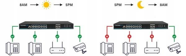 Switch, zgodnie z tendencją do oszczędzania energii na całym świecie, może skutecznie kontrolować zasilanie oprócz możliwości zapewnienia wysokiej mocy watów. Funkcja Harmonogram PoE pomaga włączać i wyłączać zasilanie PoE dla każdego portu PoE w określonych odstępach czasu i jest to potężna funkcja pomagająca małym i średnim firmom lub przedsiębiorstwom oszczędzać energię i pieniądze.
