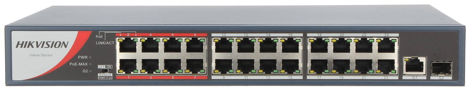 DS-3E0326P-E/M(C) to switch PoE marki Hikvision z serii Value. Urządzenie wyposażone zostało w 24 porty z obsługą technologii PoE, 1 port gigabitowy typu Uplink oraz 1 port combo oferujący wybór między gigabitową wkładką SFP, a gigabitowym portem RJ45. Całkowity budżet zasilania PoE dla wszystkich podłączonych urządzeń wynosi 230W. Przełącznik sieciowy został wyposażony w funkcje trybu dalekiego zasięgu, która umożliwia współpracę z kamerami IP na odległość sięgającą 300 m. Metalowa obudowa switcha i zastosowane zabezpieczenia doskonale chronią urządzenie, a specjalnie zaprojektowana kosntrukcja zapobiega przegrzewaniu się. Dodatkowo dołączone do zestawu uchwyty RACK pozwalają na montaż w szafach teleinformatycznych. Użytkowanie switcha jest bardzo proste, a dzięki zastosowaniu techniki plug&play instalacja przebiega szybko i bezproblemowo.