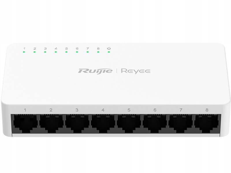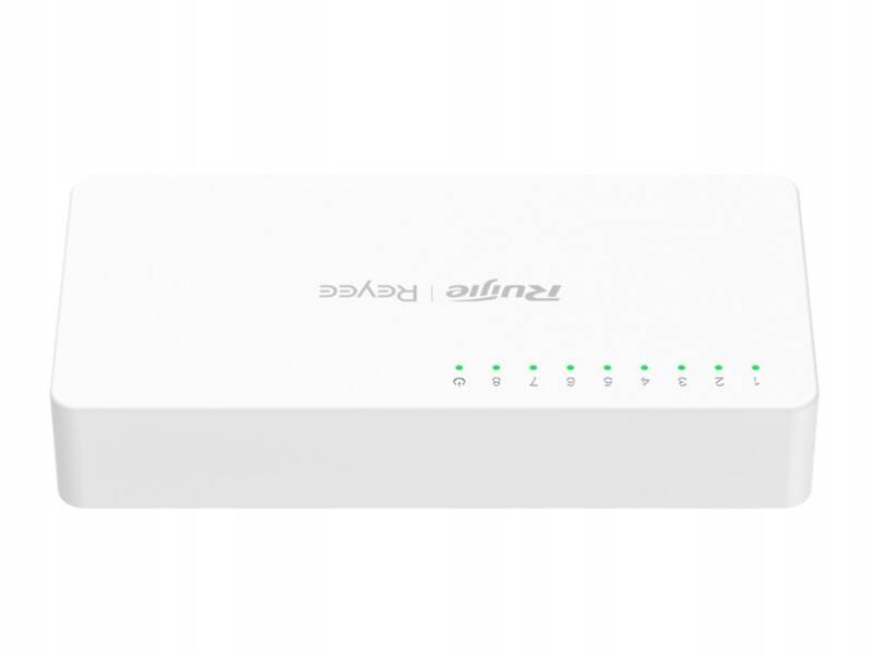 Switch RG-ES08G-L marki Reyee by Ruijie to uniwersalny przełącznik sieciowy przeznaczony do użytku domowego lub biurowego. Urządzenie posiada 8 portów RJ45 o prędkości 10/100/1000 Mbps. Dodatkowym atutem jest funkcja Plug and Play dzięki której jest zapewniona prosta i bezproblemowa instalacja.
