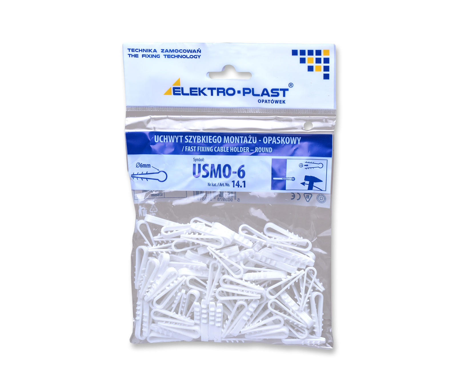 Uchwyty montażowe USMO firmy Elektro-Plast przystosowane są do montowania przewodów elektrycznych płaskich, telekomunikacyjnych, sterowniczych oraz rurek instalacyjnych do różnych powierzchni. Zastosowanie uchwytów montażowych do przewodów gwarantuje min. bardzo szybki montaż, pewność mocowania, profesjonalny wygląd instalacji, Wykonane z polipropylenu uchwyty stosowane są zazwyczaj do mocowania przewodów do ścian lub podłóg. Szczególnie często wykorzystywane jako uchwyt przytrzymujący przewód na ścianie podczas nakładania tynków, płyt gipsowych lub podczas wykonywania wylewek, podłóg itp.