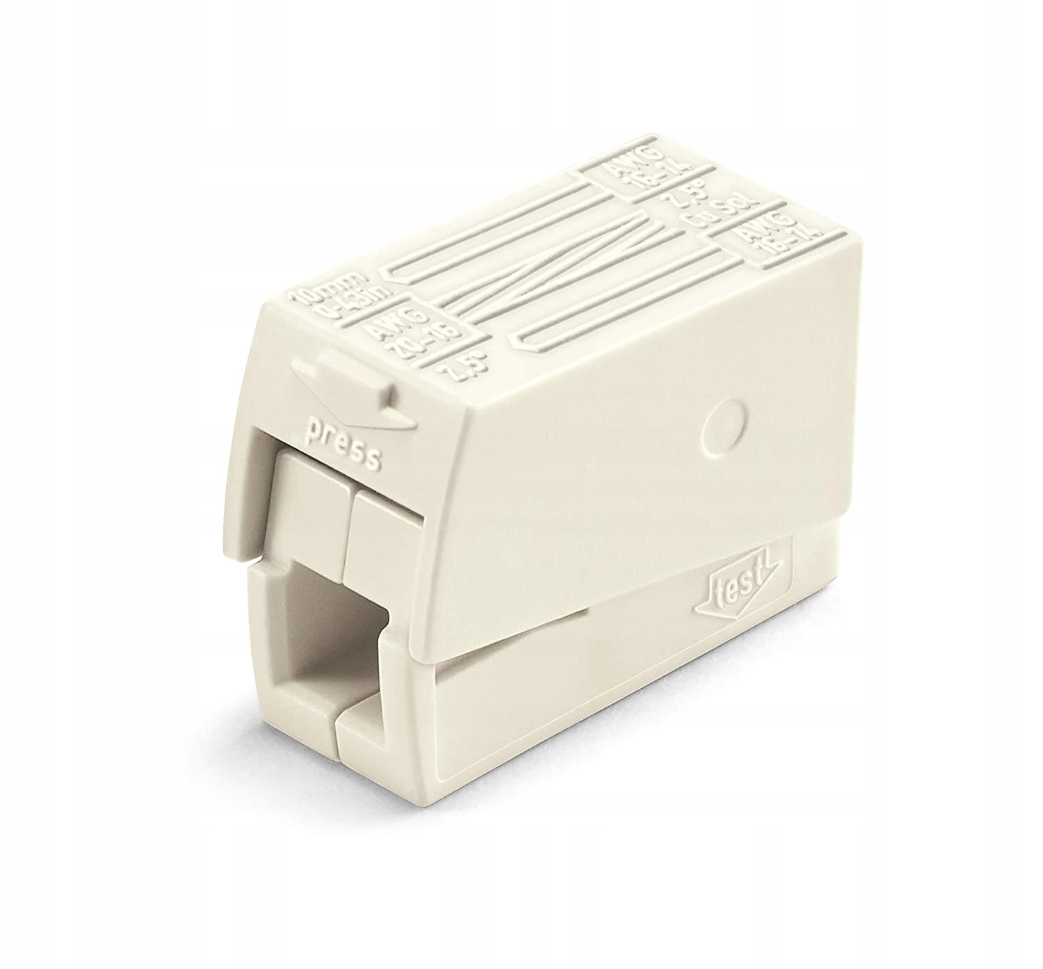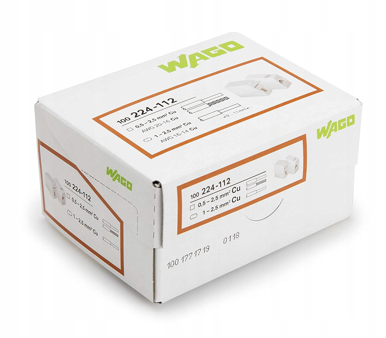 2-przewodowa złączka oświetleniowa; przyciski: od strony oprawy ośw.; od strony oprawy: do wszyst. rodz. prze.; od strony instalacji: do przew. jednodr.; seria 224; maks. 2,5 mm2; Temperatura otoczenia maks. 60 °C; 2,50 mm2; biały