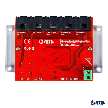 Urządzenia serii APT (Atte Power Tree) zapewniają kompatybilność ze standardami IEEE 802.3af/at/bt90 jako odbiorniki PoE oraz IEEE 802.3af/at/bt60 na wszystkich portach wyjściowych. Po podłączeniu urządzenia do portów 2-5 następuje identyfikacja odbiornika i jeżeli jest to urządzenie zasilane z PoE włączone zostanie zasilanie w porcie.