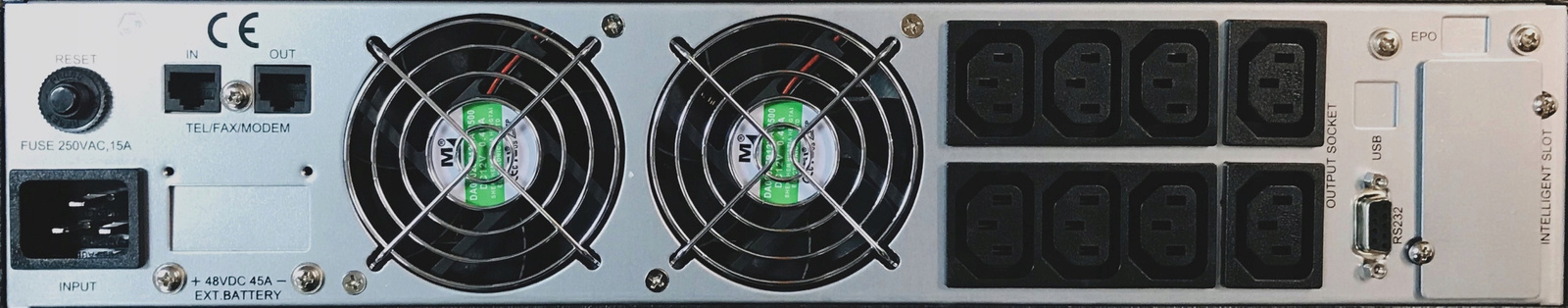 W tylnej ścianie obudowy zasilacza umiejscowione zostały gniazda do podłączenia urządzeń elektrycznych i RS-232, zabezpieczenie RJ45. Interfejs RS232 umożliwia połączenie UPS'a z komputerem, dzięki temu użytkownik może skonfigurować i zdalnie nadzorować pracę zasilacza. Gniazda RJ45 zabezpieczają urządzenia sieciowe przed przepięciami. Rozwiązanie to zostało stworzone z myślą o kompleksowej ochronie przed uszkodzeniami elementów struktur ethernetowych. Za pracę na baterii odpowiada nowoczesny akumulator w technologii AGM.