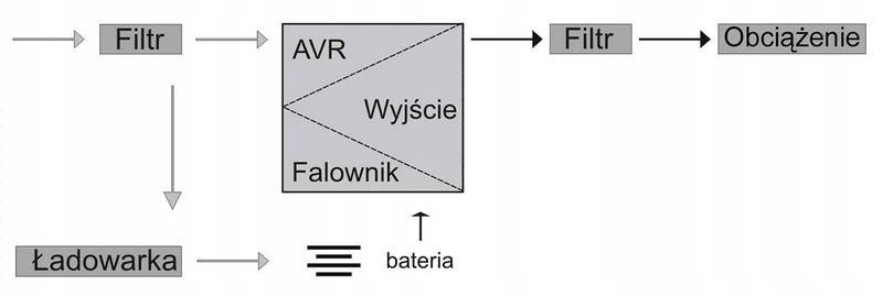Kiedy UPS jest w normalnym trybie pracy, prąd przechodzi przez filtr i "szkodliwe" fale są filtrowane. Następnie UPS ładuje baterię, zasila falownik i dostarcza przefiltrowany prąd na wyjście urządzenia.