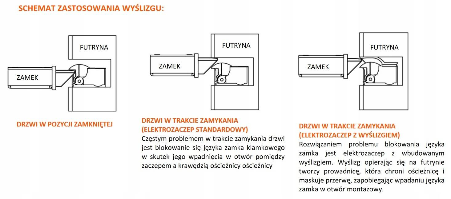 Wyślizg (prowadzenie języka zamka) zapewnia gładką pracę języka zamka klamkowego, jednocześnie chroniąc ościeżnicę przed zniszczeniem. Zapobiega również wpadaniu języka zamka klamkowego w przestrzeń pomiędzy elektrozaczepem a ościeżnicą, co może powodować zablokowanie drzwi. Wyślizg zintegrowany z elektrozaczepem, a także wyślizg zastosowany w blasze zaczepowej jest idealnym rozwiązaniem do drzwi bezprzylgowych (bezfelcowych) i wąskich ościeżnic.