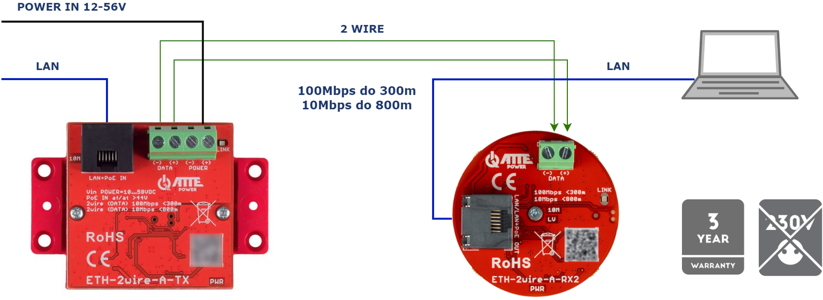 Nadajnik ETH-2wire-A-TX zasilany jest z dowolnego switcha PoE (port RJ45), a następnie z wykorzystaniem 2 przewodów, umożliwia dwukierunkową komunikację sieciową oraz zasilanie odbiornika ETH-2wire-A-RX2 wraz z kamerą IP PoE. Port wyjściowy LAN pracuje w standardzie 802.3af/at/bt.