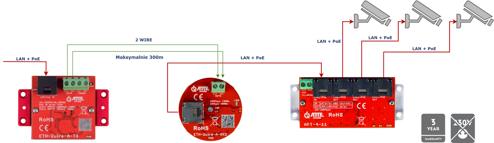 Przykład zastosowania ETH-2wire-A-SE2 do zasilenia 3 kamer IP PoE po dwóch przewodach w połączeniu z switchem APT-4-11.