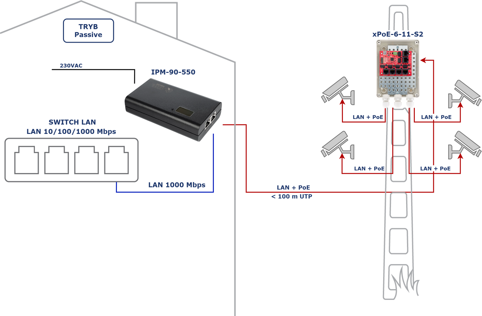 Przykładowe zastosowanie IPM-90-550 jako Midspan PoE dla switcha xPoE-6-11-S2 w trybie pracy PoE Passive.