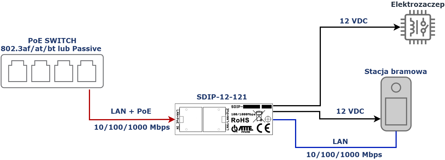 • SDIP-12-121 to gigabitowy adapter PoE z przetwornicą obniżającą napięcie. Urządzenie pozwala nam na zasilanie urządzeń o nominalnym napięciu 12V z portu PoE 802.3af.