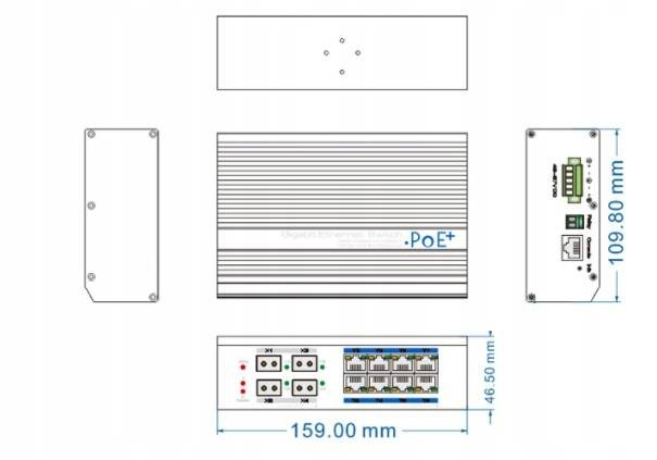 - Interfejs: 8x 10/100 / 1000Base-T portów RJ45 (PoE), 4x porty 1000BASE-X SFP (rozłączane)