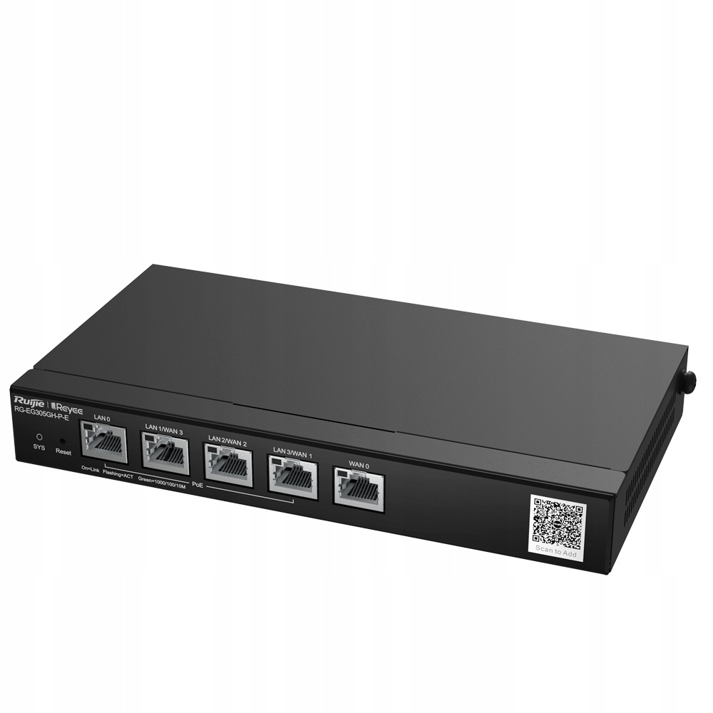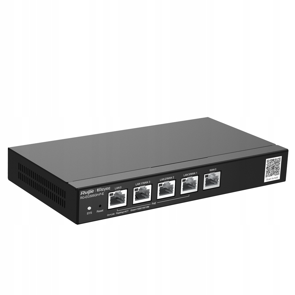 Ruijie RG-EG305GH-P-E to zaawansowany router przewodowy o wysokiej wydajności. Zapewnia przepustowość wynoszącą 1,5 Gb/s. Wyposażony w 5 portów RJ45 (1x LAN, 3x LAN/WAN oraz 1x WAN), działającymi w standardzie Gigabit Ethernet (10/100/1000 Mb/s). Dodatkowo porty LAN od 0 do 3 są portamiPoE o łącznym budżecie 60 W, dzięki czemu można zasilać urządzenia sieciowe, takie jak kamery IP czy telefony VoIP, bez konieczności stosowania dodatkowego zasilania. Posiada wiele zaawansowanych funkcji, jednocześnie będąc prostym w konfiguracji i obsłudze. Może być zarządzany za pomocą strony internetowej lub aplikacji Ruijie Cloud.