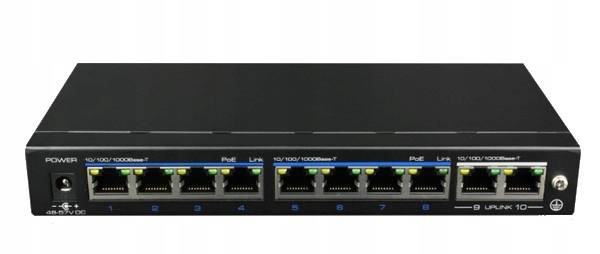- Interfejs: 8x 10/100 / 1000Base-T portów Ethernet (PoE), 2x Uplink 10/ 100/ 1000BASE-T portów Ethernet