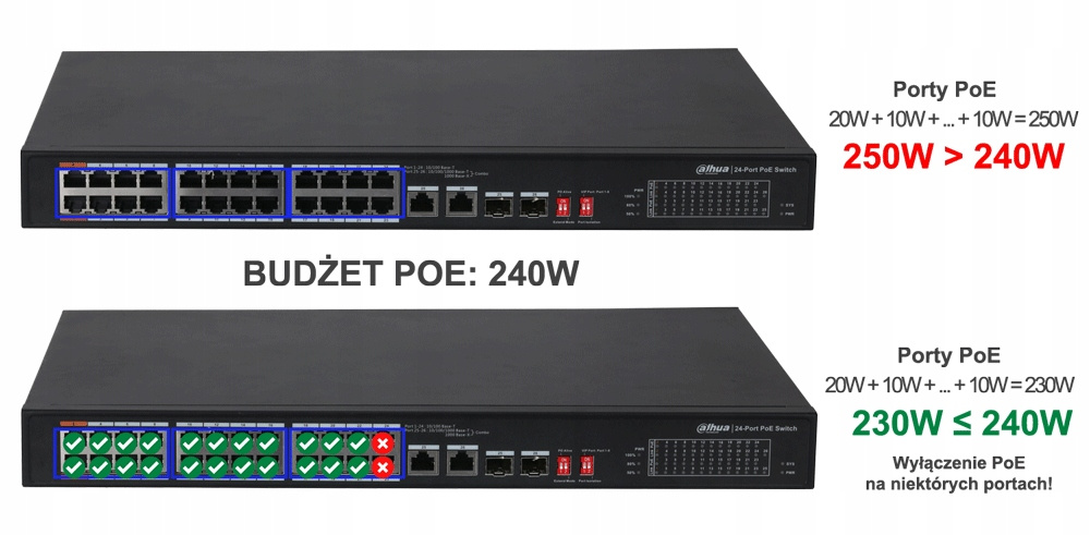W urządzeniu zastosowano dwadzieścia cztery porty PoE z których każdy umożliwia zasilanie urządzenia docelowego o poborze mocy nieprzekraczającej 30W (wyjątkiem stanowią 2 pierwsze porty z obsługą standardu Hi-PoE, które mogą dostarczać moc na poziomie do 60W). Dodatkowym atutem switcha PoE Dahua jest funkcja związana z inteligentnym mechanizmem ochronny, który na bieżąco reguluje pobór zasilania w momencie przeciążenia. Jeżeli wszystkie zasilane urządzenia przekroczą wartość 240W, switch automatycznie rozłączy port komunikacyjny o najniższym priorytecie. Takie rozwiązanie uchroni instalację przed przeciążeniem i zabezpieczy prawidłowe i nieprzerwane funkcjonowanie pozostałego sprzętu.
