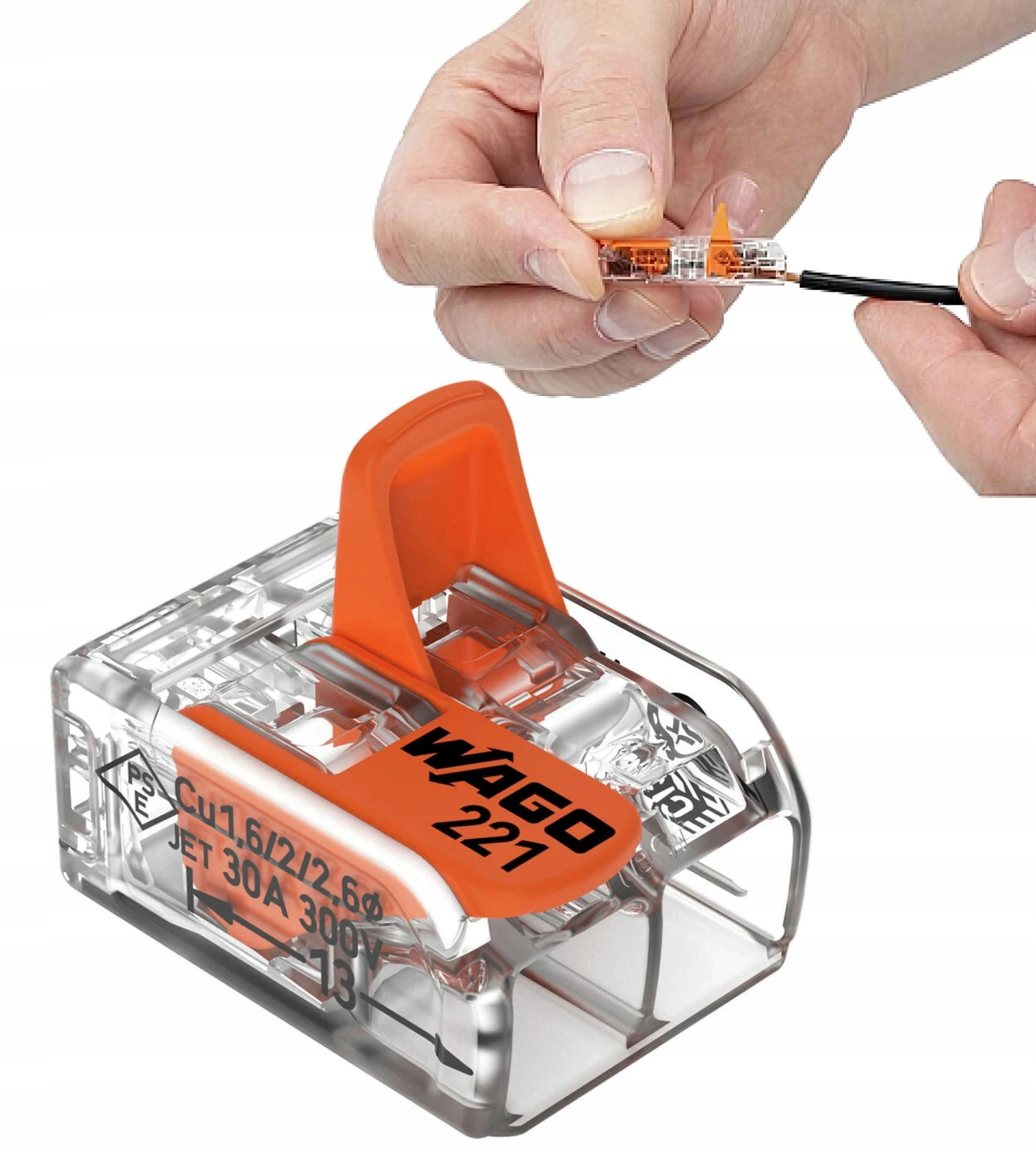 Nowa rodzina złączek WAGO z serii 221 umożliwia szybsze i prostsze tworzenie bezpiecznej instalacji z wykorzystaniem różnych typów przewodów: jednodrutowych, linkowych lub wielodrutowych. Złączki 221 mają jeszcze mniejsze gabaryty, co znacznie rozszerza zakres ich zastosowań. Seria 221 przeznaczona jest do prądu nominalnego 30A oraz napięcia nominalnego 300V i dzięki temu może być stosowana w sieciach 230V / 300V. Przezroczysta obudowa zapewnia pełną kontrolę umieszczenia przewodów.