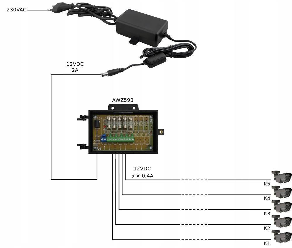 Zasilacz przeznaczony jest do zasilania z sieci 230V AC kamer telewizji przemysłowej wymagających napięcia 12V DC.