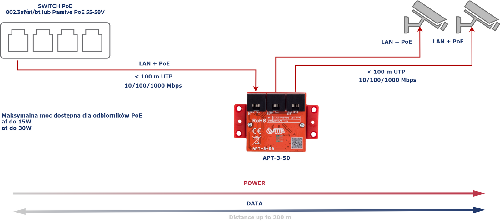 Urządzenie umożliwia nam zasilanie do 2 odbiorników PoE za pomocą jednego przewodu UTP. W sytuacjach, kiedy nie mamy możliwości doprowadzenie nowego przewodu lub doprowadzenie wiązałoby się z dodatkowymi kosztami, APT-3-50 pozwala nam na wykorzystanie istniejącego już okablowania.