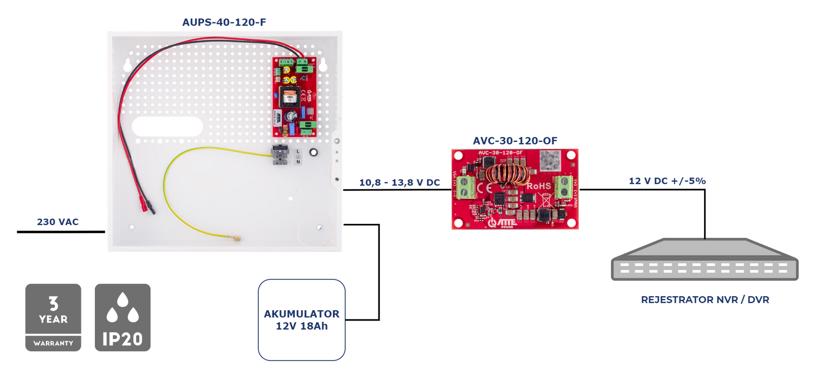 Przykład zastosowania AUPS-40-120-F do buforowego zasilenia rejestratora NVR/DVR z wykorzystaniem modułu AVC-30-120-OF