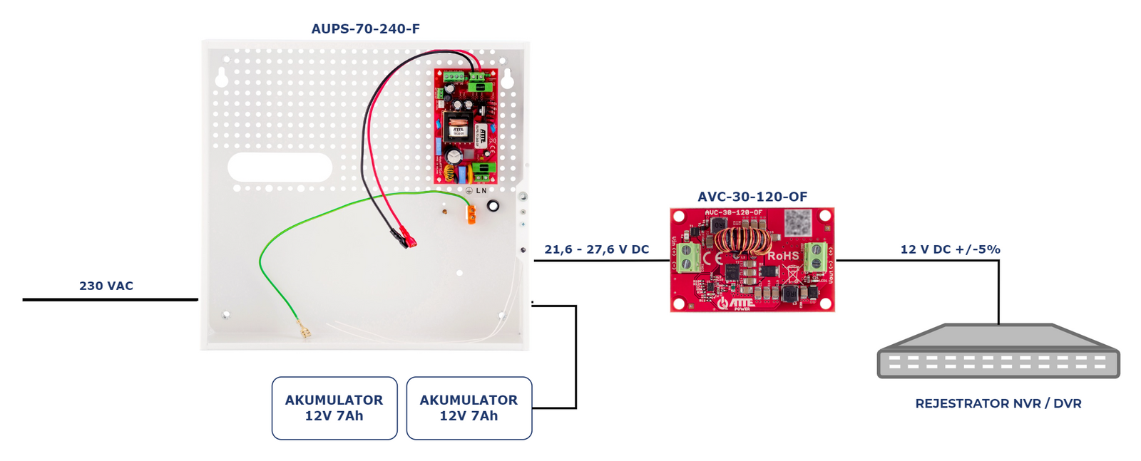 Przykład zastosowania zasilacza buforowego w połączeniu z modułem AVC-30-120-OF do zasilania rejestratora z podtrzymaniem zasilania