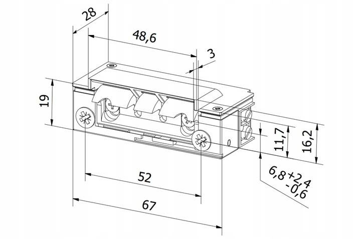 • Wymiary: szerokość x wysokość x głębokość: 19(23,5) mm x 67 mm x 28mm