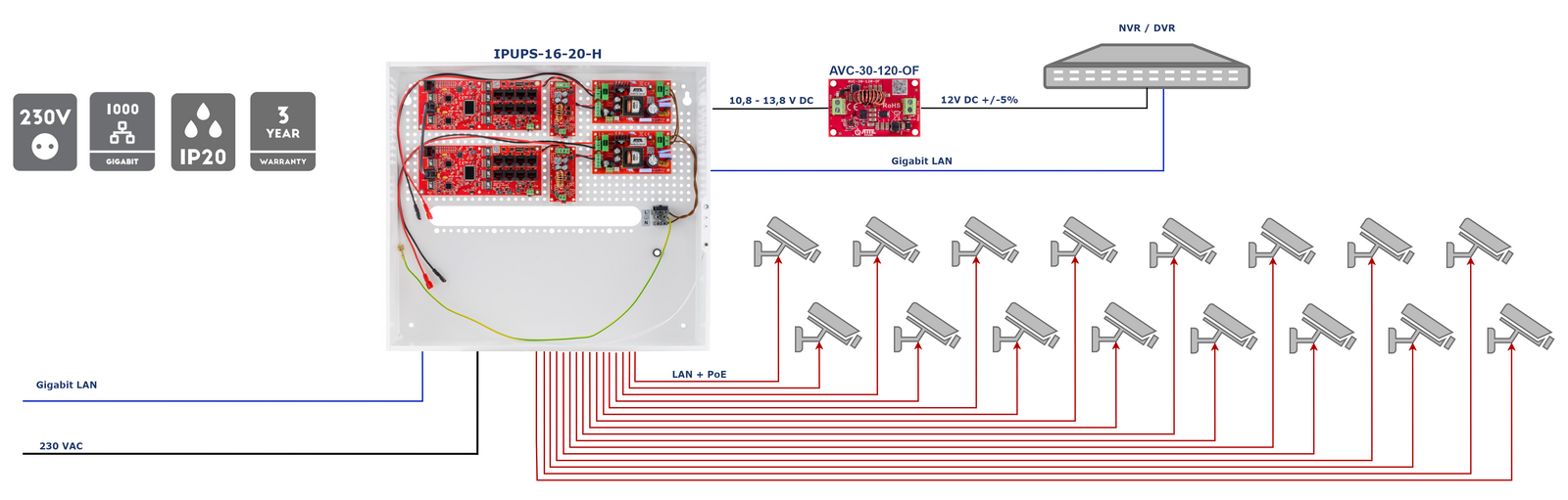 IPUPS-16-20-H to gotowy zestaw, dedykowany do buforowego zasilania systemu telewizji przemysłowej IP składającego się z 16 kamer IP. Elektroniczne zabezpieczenia wyjść PoE zapewniają ciągłość pracy całego systemu przy zwarciu, lub przeciążeniu pojedynczych gałęzi zasilania, oraz automatyczny powrót napięcia po ustąpięniu awarii. Urządzenie znajduje zastosowanie w systemach wymagających zwiększonej przepustowości sieci takich jak monitoring CCTV 4K Ultra HD.