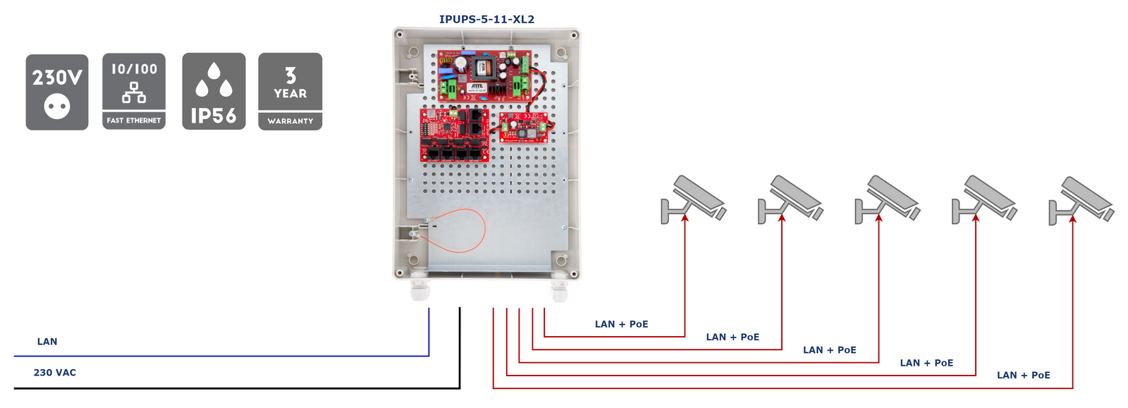 - IPUPS-5-11-XL2 to gotowy zestaw, dedykowany do buforowego zasilania systemu telewizji przemysłowej IP składającego się z 5 kamer IP.