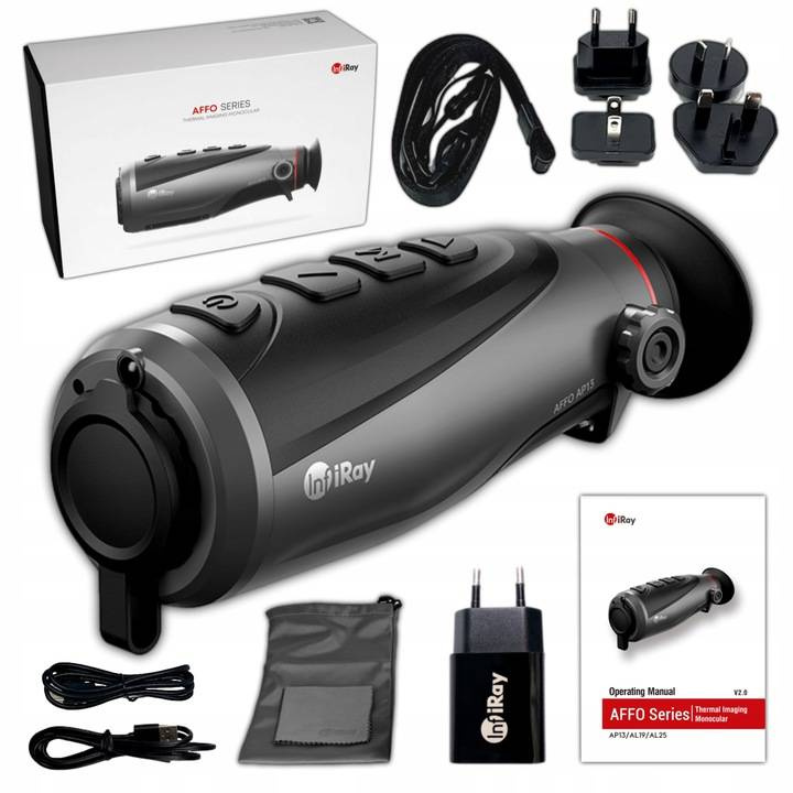 InfiRay AFFO AP13 posiada dodatkowe praktyczne funkcje, w tym stadiametryczny dalmierz i obraz w obrazie. Jego adapter jest wyposażony w wiele podróżnych głowic ładujących, aby sprostać potrzebom użytkowania w różnych krajach i regionach.