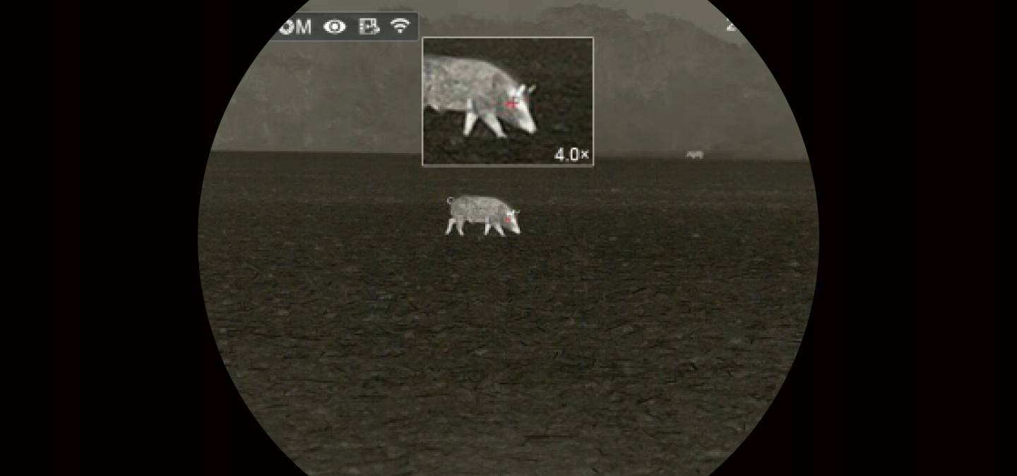 Obraz w obrazie(PIP): Ekran pozycji kursora jest powiększony dwukrotnie, aby podkreślić cel i pomóc w obserwacji szczegółów celu.