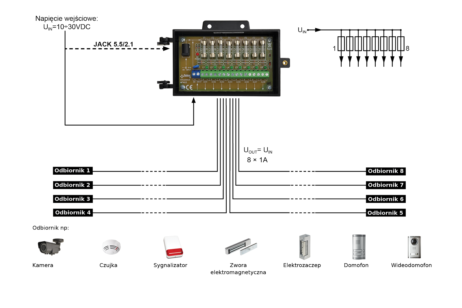 - Ilość wyjść zasilania: 8 (zaciski AUX)