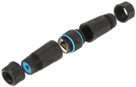 Solidne, skręcane złącze hermetyczne IP68 przeznaczone do łączenia dwóch ekranowanych przewodów sieciowych zakończonych męskimi wtyczkami RJ45 8p8c kategorii 6.