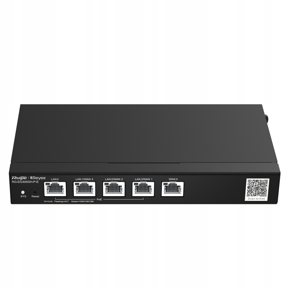 Ruijie RG-EG305GH-P-E to zaawansowany router przewodowy o wysokiej wydajności. Zapewnia przepustowość wynoszącą 1,5 Gb/s. Wyposażony w 5 portów RJ45 (1x LAN, 3x LAN/WAN oraz 1x WAN), działającymi w standardzie Gigabit Ethernet (10/100/1000 Mb/s). Dodatkowo porty LAN od 0 do 3 są portamiPoE o łącznym budżecie 60 W, dzięki czemu można zasilać urządzenia sieciowe, takie jak kamery IP czy telefony VoIP, bez konieczności stosowania dodatkowego zasilania. Posiada wiele zaawansowanych funkcji, jednocześnie będąc prostym w konfiguracji i obsłudze. Może być zarządzany za pomocą strony internetowej lub aplikacji Ruijie Cloud.