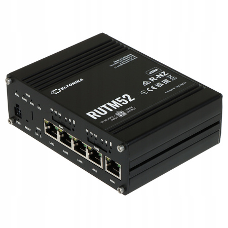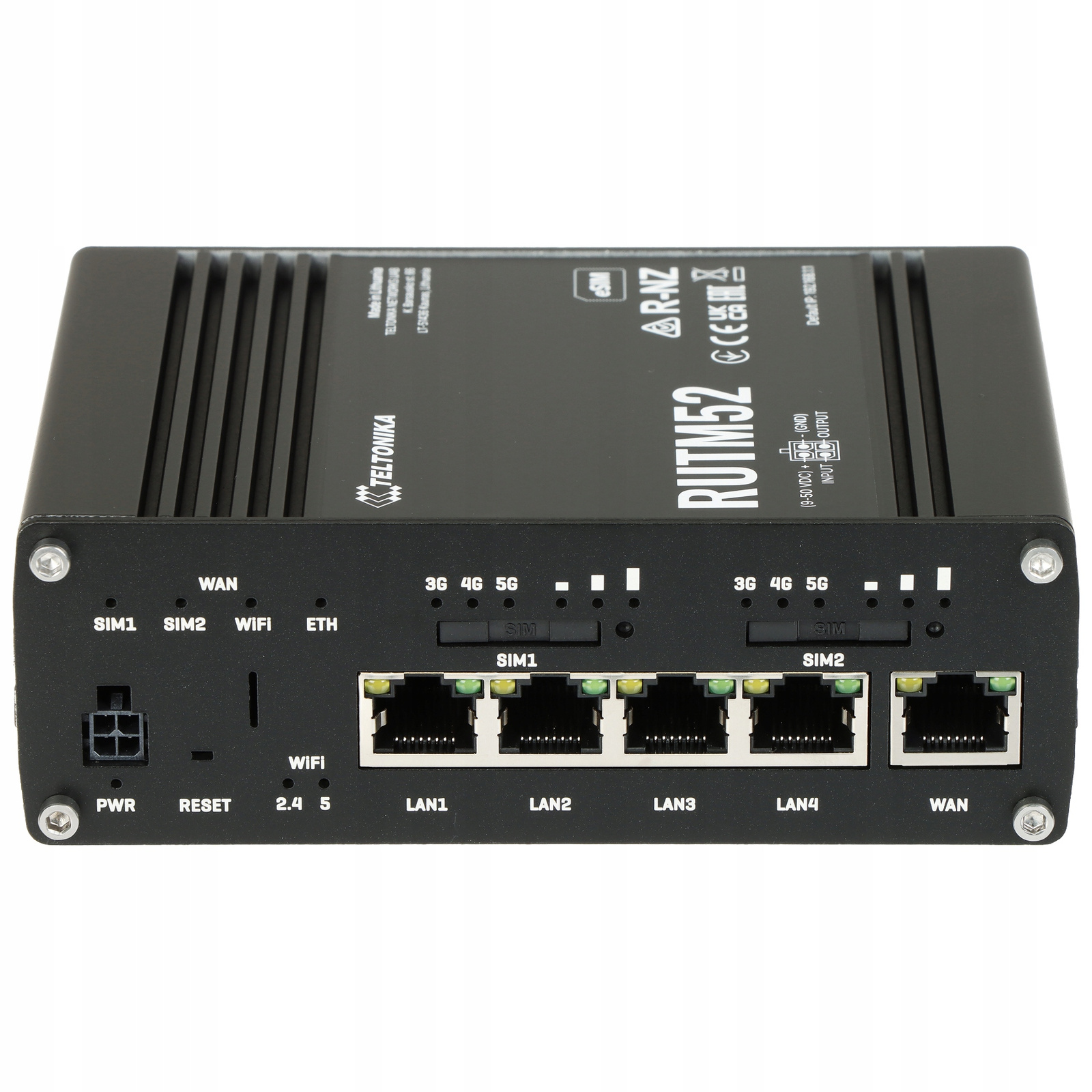Bezprzewodowy router RUTM52, działający zgodnie ze standardem IEEE 802.11 b/g/n/ac, umożliwia współdzielenie łącza sieciowego przez kilku użytkowników na obszarach objętych sygnałem 3G/4G/5G. Router RUTM52 rozgłasza 2 oddzielne sieci bezprzewodowe, w paśmie 5 GHz oraz w paśmie 2.4 GHz o maksymalnej prędkości 867 Mb/s. Zaawansowane wsparcie dla 5G Sub-6 GHz zapewnia prędkości pobierania do 3.3 Gb/s i wysyłania do 900 Mb/s, co sprawia, że jest idealny do zastosowań wymagających dużej przepustowości. Dwa jednocześnie działające modemy 5G zapewniają dużą prędkość transmisji dzięki funkcji równoważenia obciążenia. Urządzenie wyposażone jest w 5 portów Ethernet (4 x LAN + WAN), dwa sloty na karty SIM (Dual SIM + eSIM), port USB, konfigurowalne cyfrowe wejście/wyjście oraz złącza do anten 5G, LTE, Wi-Fi i GNSS (Globalny System Nawigacji Satelitarnej). Urządzenie jest zgodne z technologią IoT (Internet rzeczy). Rutererem zarządza system operacyjny RutOS i obsługuje protokoły przemysłowe, takie jak Modbus, DLMS, DNP3, OPC UA, a także jest kompatybilny z systemem zarządzania RMS umożliwiając wydajne zdalne i lokalne zarządzanie urządzeniem. Do zarządzania dedykowana jest aplikacja Teltonika RMS Router Teltonika RUTM52 posiada 4-pinowe przemysłowe gniazdo zasilania oraz obsługuje szeroki zakres napięć zasilania.
