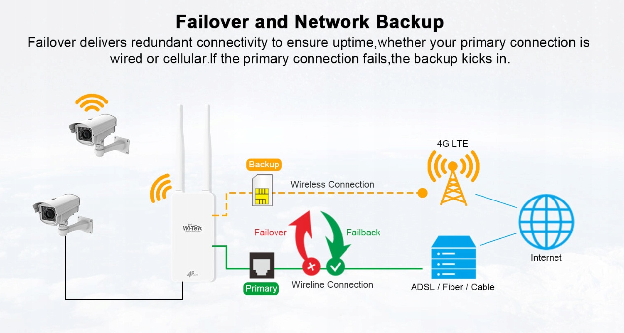 Wi-Tek WI-LTE115-O V2 to zewnętrzny router bezprzewodowy 4G LTE, posiadający kartę plug-in, która jest automatycznie podłączona do sieci. Router WI-LTE115-O V2 posiada obudowę IP65, która jest pyłoszczelna i wodoodporna. Świetnie radzi sobie w trudnych warunkach pogodowych na zewnątrz budynku.
