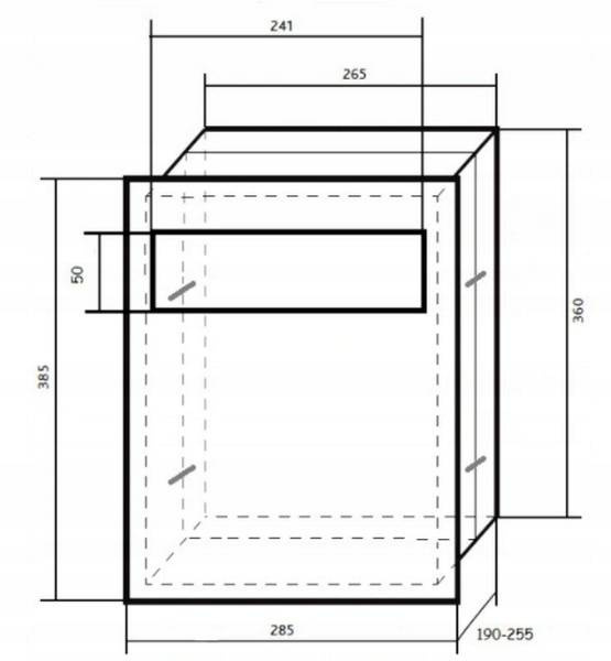 Szuflada o szerokości 265 mm jest dwuczęściowa i rozsuwana. Szuflada to pojemnik na korespondencję wbudowywany w słupek lub mur. W tym modelu została wykonana jest ze stali szlachetnej. Dzięki rozsuwanej szufladzie głębokość skrzynki może być regulowana w zakresie 190-255 mm.