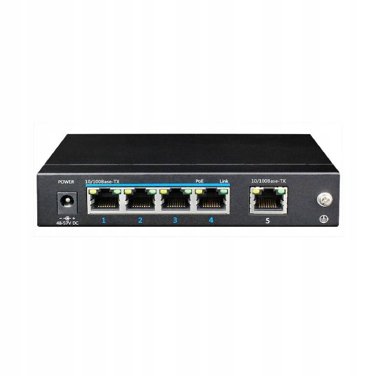 Prezentowany switch 5-portowy Full Gigabit PoE został specjalnie zaprojektowany do zastosowań w systemach monitoringu sieci o wysokiej rozdzielczości. Przełącznik PoE zapewnia 4 gigabitowe porty downlink PoE obsługujące 802.3at i 1 port Gigabit uplink. Całkowita moc wyjściowa PoE wynosi do 60 watów. Jest szeroko stosowany w monitorach przetrwania i rozwiązaniach sieciowych Ethernet.