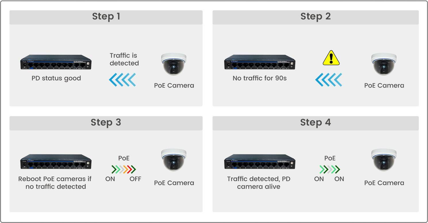 - Budżet POE: Maks. 90 W dla portu 1, maks. 45 W dla portów od 2 do 4 każdy