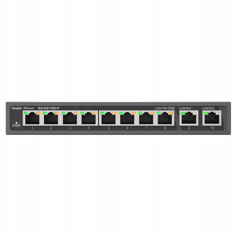 Ruijie RG-ES110D-P to 10-portowy przełącznik PoE Fast Ethernet, wyposażony w 8 portów PoE 10/100 Mb/s i 2 porty Uplink 10/100/1000 Mb/s. Zapewnia przepustowość wynoszącą 5,6 Gb/s.  Jest wyposażony w funkcję AUTO MDI/MDIX, która automatycznie dostosowuje połączenie, eliminując potrzebę używania specjalnych kabli krosowych. RG-ES110D-P jest łatwy w instalacji obsłudze, a kompaktowa obudowa oraz diody LED informujące o stanie połączenia ułatwiają monitorowanie pracy urządzenia. Mimo tego, że switch jest niezarządzalny, możemy go monitorować z poziomu aplikacji Ruijie Cloud (jeśli w sieci znajduję się przynajmniej 1 przełącznik zarządzalny). Przełącznik RG-ES110D-P jest idealnym rozwiązaniem dla małych i średnich sieci, zapewniając nie tylko wydajną transmisję danych, ale także dostarczając zasilanie dla urządzeń PoE.