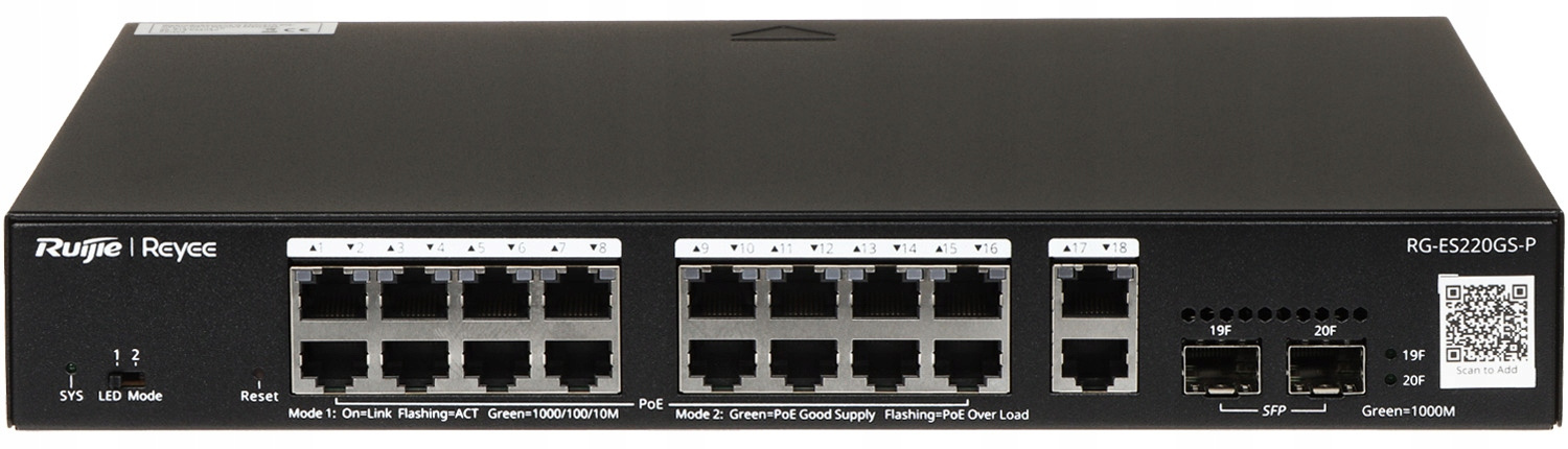 RG-ES220GS-P to zarządzalny przełącznik sieciowy marki Reyee, oferujący 20 gigabitowych portów, z czego 16 obsługuje PoE+ (Power over Ethernet). Dodatkowo wyposażony jest w 2 porty RJ45 oraz 2 porty SFP dla uplinków światłowodowych. Całkowity budżet mocy PoE wynosi 250W, co pozwala na zasilanie urządzeń takich jak kamery IP czy punkty dostępowe bez potrzeby dodatkowych zasilaczy