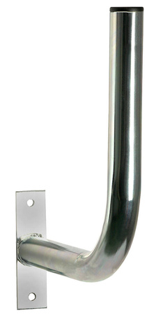 Uchwyt wykonany z płaskownika stalowego grubości 4 mm z przyspawaną do niego rurą stalową, cynkowany. Kapturek z tworzywa sztucznego zapobiega przedostawaniu się wody do wnętrza. Polecamy do montażu anteny do ściany. Masa uchwytu 0,97 kg.