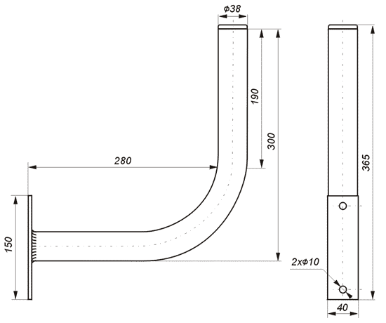 Uchwyt antenowy murowy UR-38L30 wykonany z płaskownika stalowego grubości 4 mm z przyspawaną do niego rurą stalową, cynkowany.