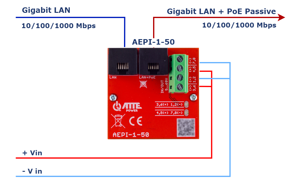 Niezależne terminale połączeniowe przypisane konkretnym parom skrętki UTP pozwalają na przesłanie pomiędzy dwoma urządzeniami AEPI-1-50 jednym przewodem dwóch różnych poziomów napięcia przy zachowaniu transmisji o prędkości do 1000 Mbps.